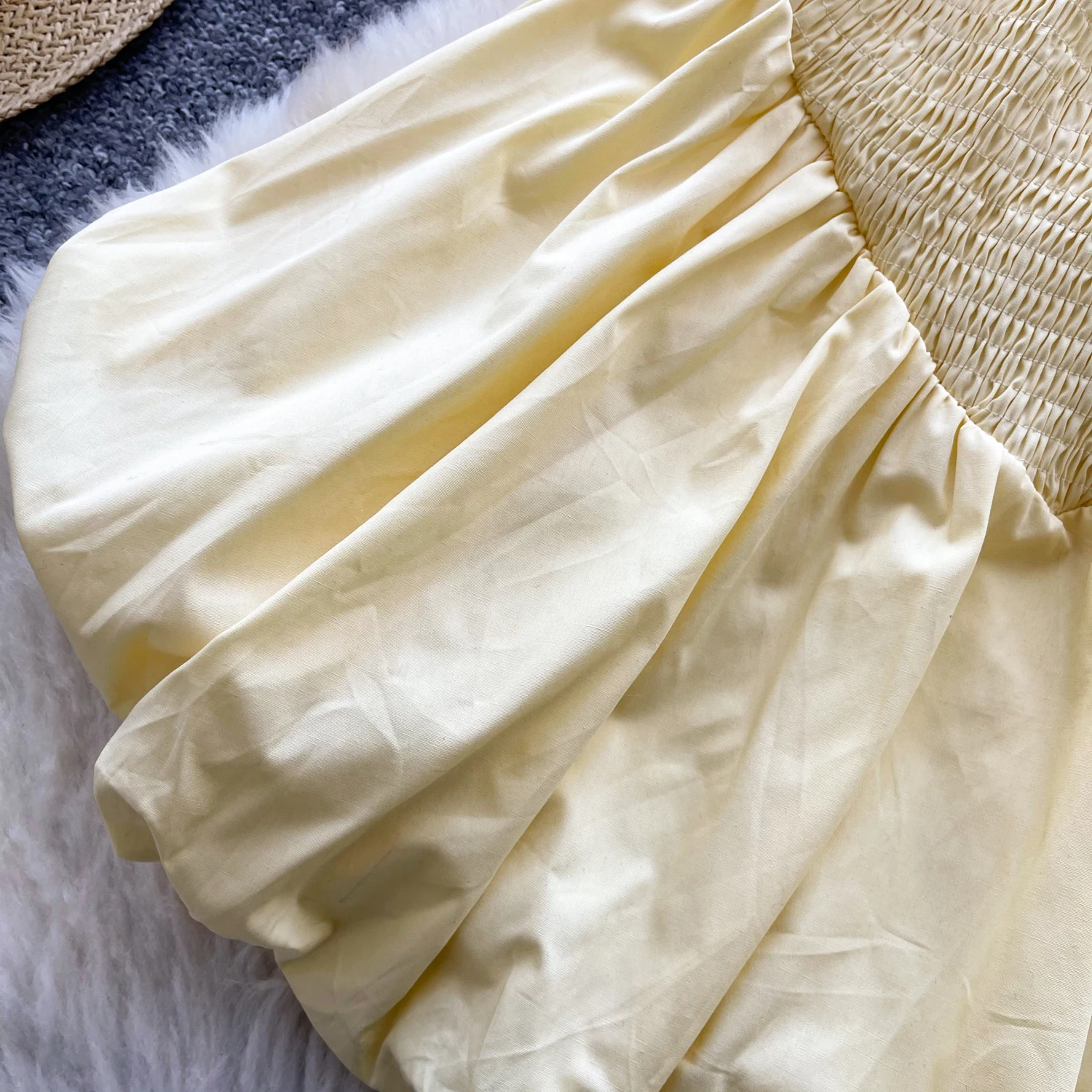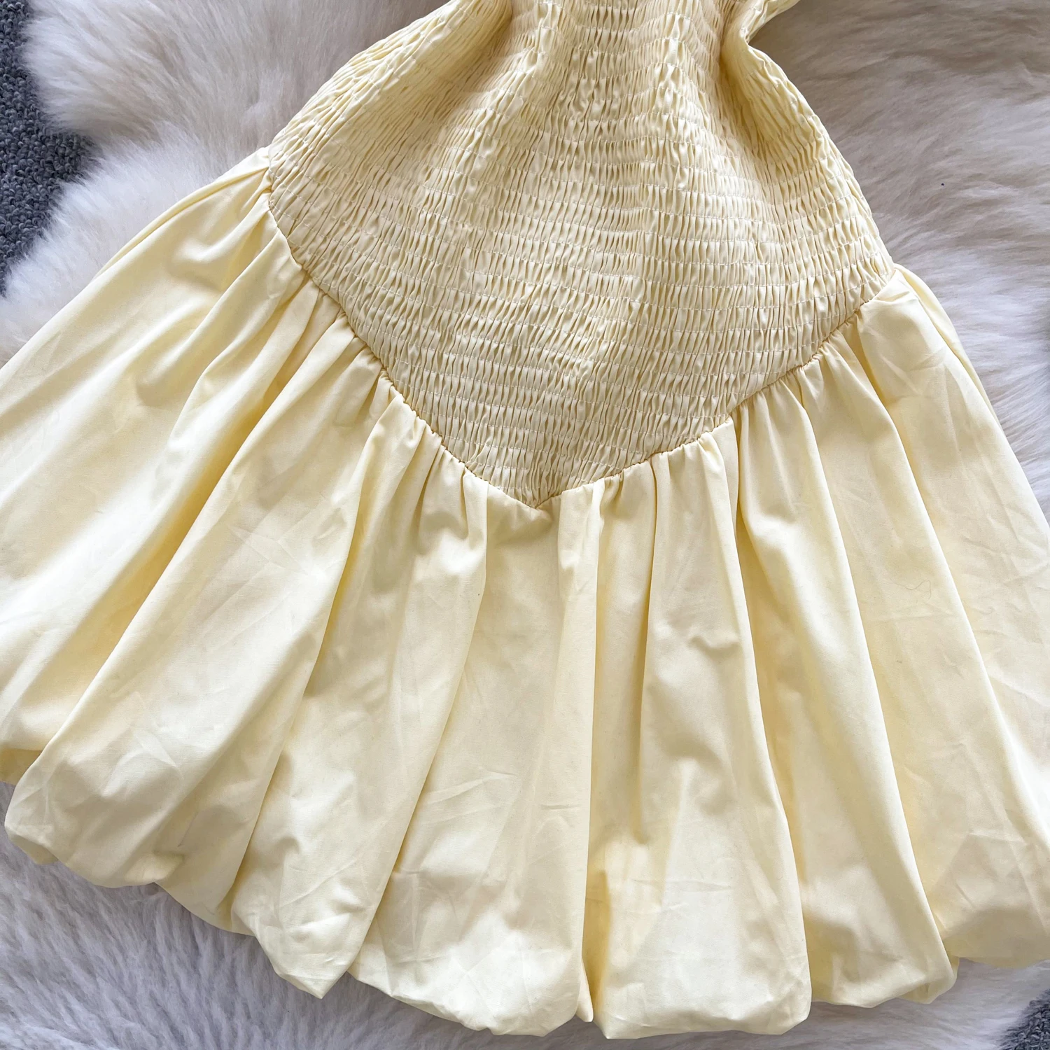 Highly Concerned Chemicals: None Neckline: Strapless Waist Type: Elastic Waist Pattern Type: Solid Color Shape: A-Line Skirt Material: Polyester Color: Light-yellow Size: XS-L..
